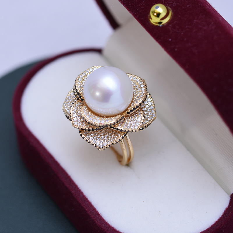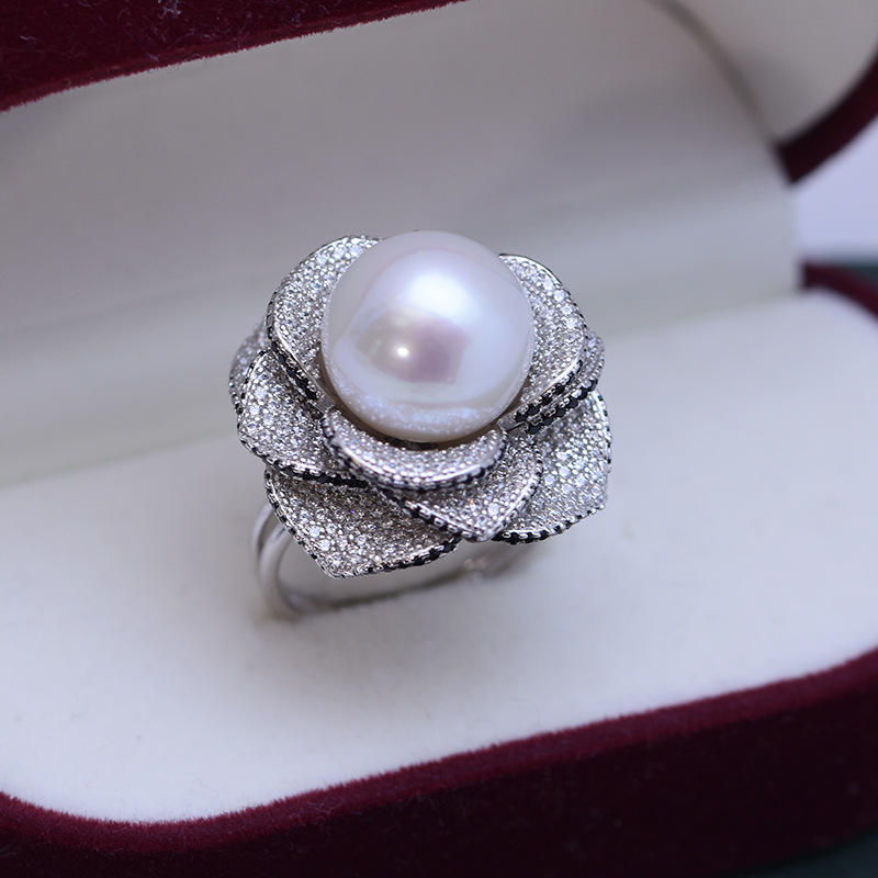 Edison Zhuji 12-13mm White Freshwater Pearl Ring Strong Light Fine Flaws S925 Silver Petal Elegant Design