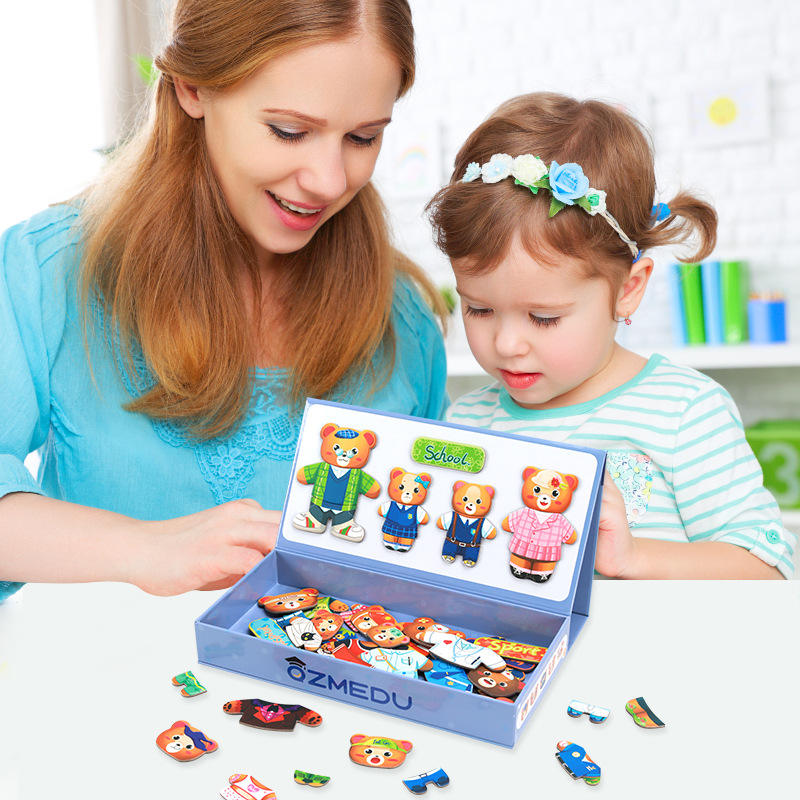 Nouveau Design créatif dessin animé ours assortis robe Puzzle en bois magnétique Puzzle pour enfants
