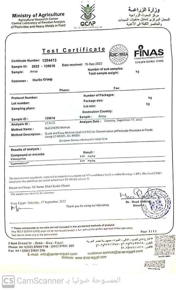 Nayural anise seeds, Free of pesticidesSpécification