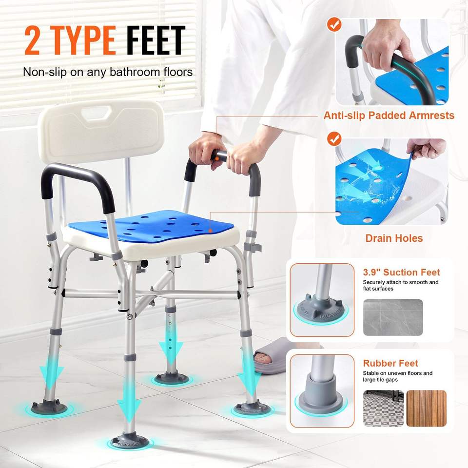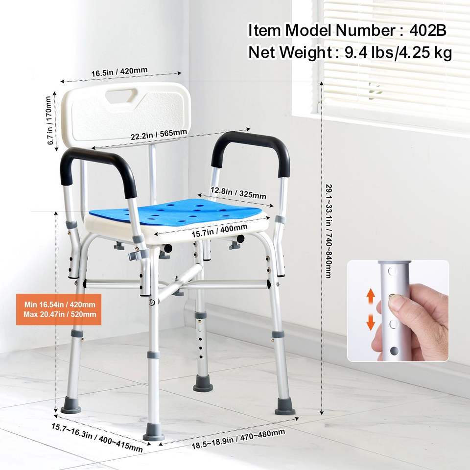 Chaise de bain réglable en hauteur Elde, tabouret de douche avec accoudoirs rembourrés, dossier et barre transversale renforcée, équipement de sécurité pour la salle de bain