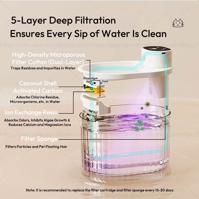 Dispositif:Automatique, Portable, Réglable, Ultra silencieux, Antidérapant, Écologique, Léger, Durable, Preuve de fuite, Facile à nettoyer, système de filtration, Matériel de qualité alimentaire, encourager à boire, Transparent, Bol amovible, Fontaine à eau automatique pour animaux de compagnie