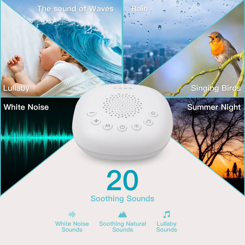 Veilleuse électrique blanche pour bébés et enfants, dispositif d'aide au sommeil portable, 20 sons apaisants, rythme cardiaque, volume réglable RVB