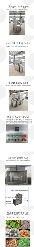 Machines Fonction:Le couvercle automatique verrouille la fraîcheur et la décharge inclinée évite la surcuisson, Traitement par lots de grande capacité, et l'orifice de drainage facilite le changement d'eau., Il est entièrement fabriqué en acier inoxydable 304 et le cadre en maille peut être retiré dans son ensemble pour le nettoyage., Blanchir le brocoli, les haricots verts et les épinards. Contrôle précis de la température et couleur vive., Pâtes précuites, nouilles de riz et raviolis. Levage automatique sans remplacement, décharge inclinée sans adhérence., Chauffage électrique, pas de flamme nue, pas de gaz d'échappement, rendant la cuisine plus sûre et plus fraîche, Corps de pot épaissi, composants de qualité industrielle, spécialement conçus pour une utilisation quotidienne continue à haute intensité