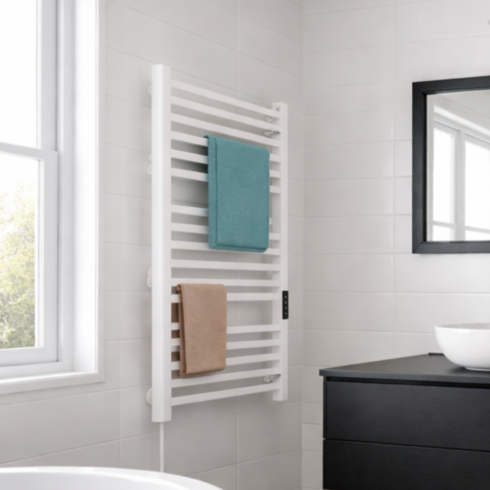 Sèche-serviettes électrique mural avec barre de serviettes pliable et mobile, design moderne, étanche IPX4, pour salle de bain