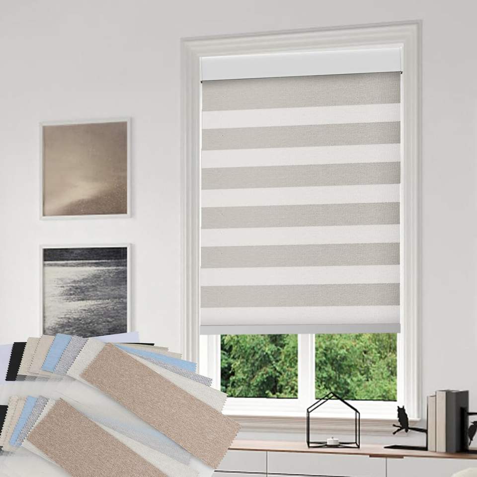 Stores occultants électriques modernes enrouleurs horizontaux en tissu uni transparent, étanches, intégrés, pour fenêtre française, avec batterie au lithium, motif zèbre, petite taille