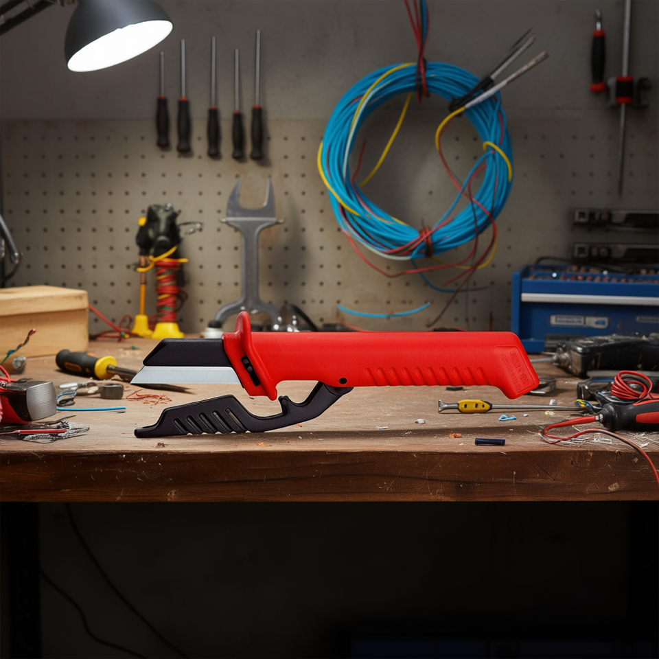 Couteau d'électricien avec lame interchangeable, manche rouge, pour une coupe de précision et des travaux électriques