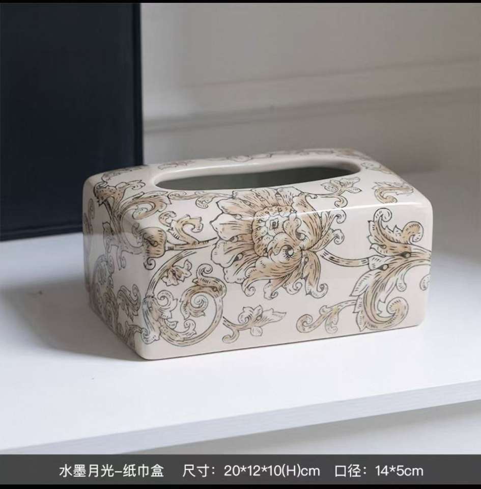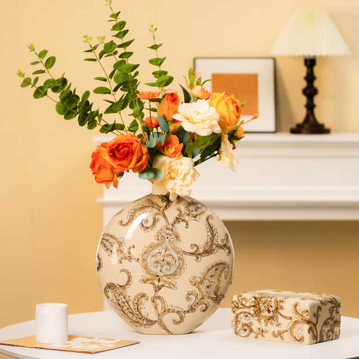 Vase en céramique beige élégant et boîte à mouchoirs, motif floral paisley, accent chinoiserie pour la décoration de la maison