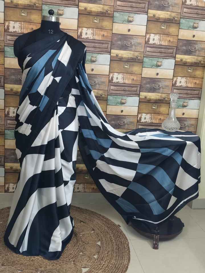 Elegant Black Blue White Abstract Print Silk Sari Adults Stylish Traditional Ethnic Wear Sexy Fashion Dress Casual Formal