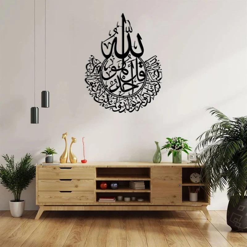 Elegant Black Metal Islamic Wall Art Luxury Home Decor Featuring Quran Calligraphy Surah Ikhlas Allah Name