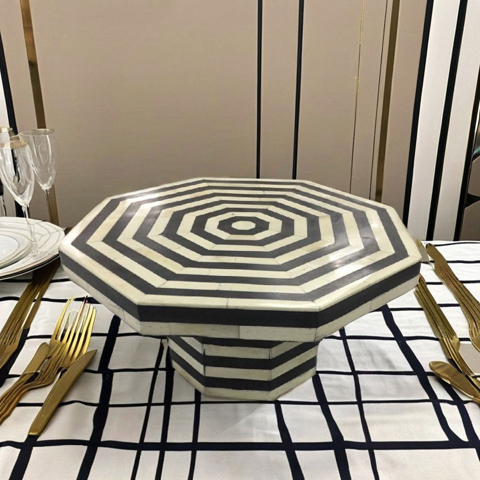 Support octogonal élégant en incrustation d'os noir et blanc pour gâteau, durable, fait à la main, écologique, présentoir de coupe-gâteau, vaisselle commerciale