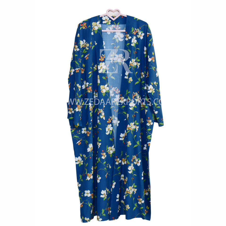 Product Name:Blue Floral Print 100% Cotton Long Kimono Robe Ladies Sleepwear