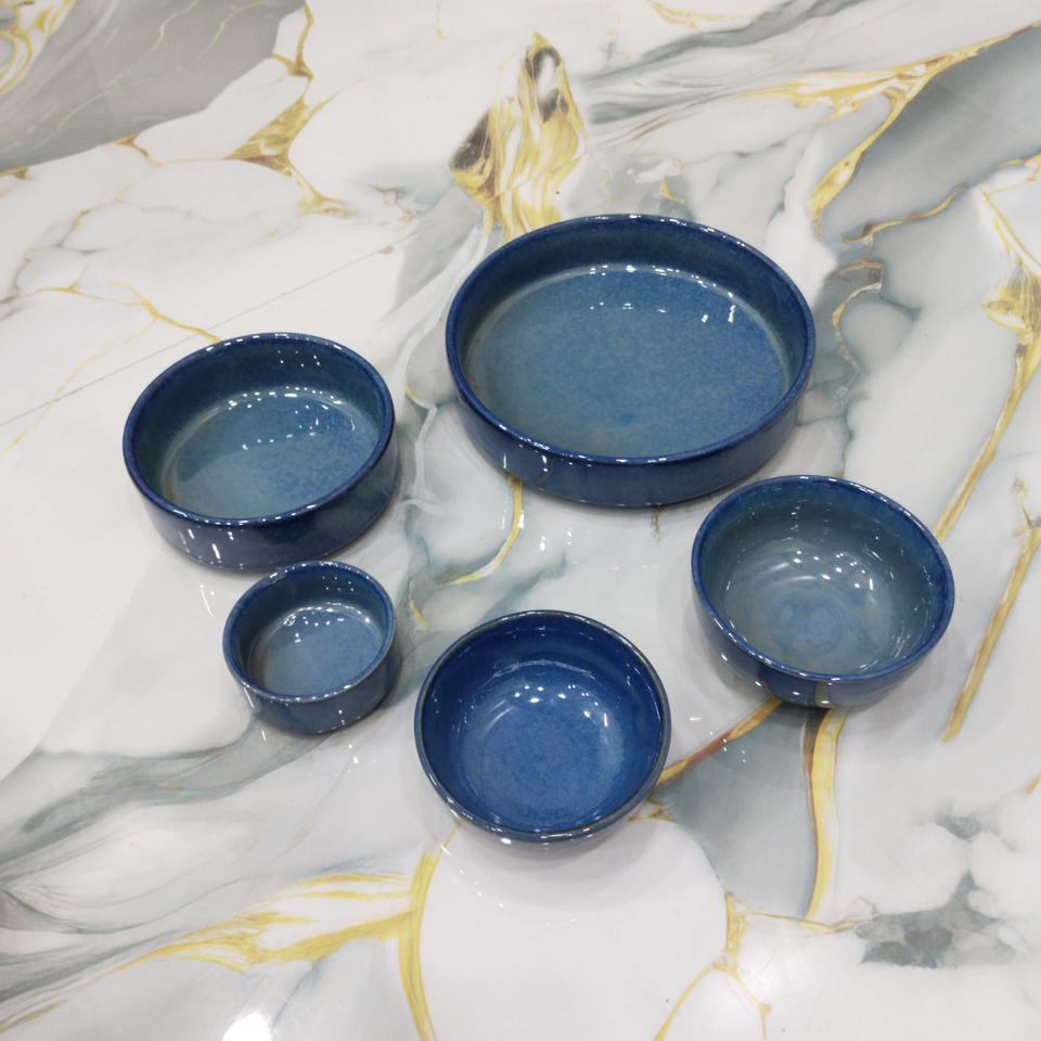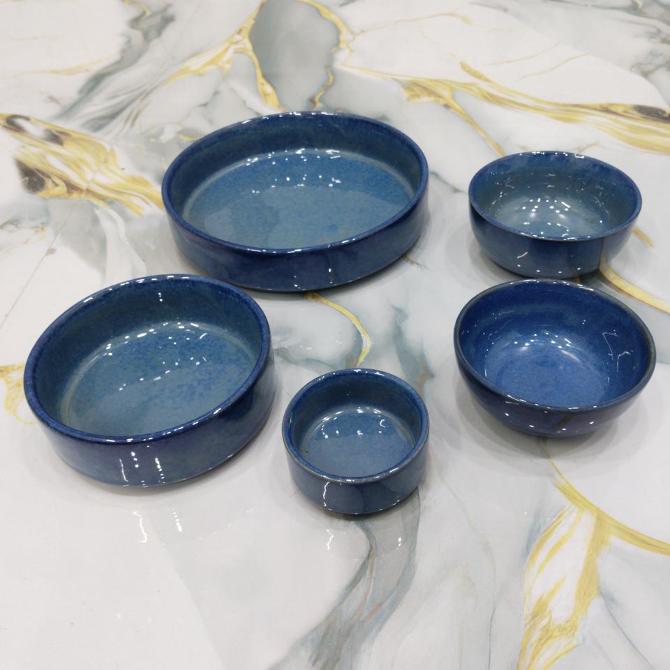 Collection de vaisselle élégante en porcelaine bleue avec bols coordonnés, plat de service, cuisine sophistiquée pour restaurants ou hôtels