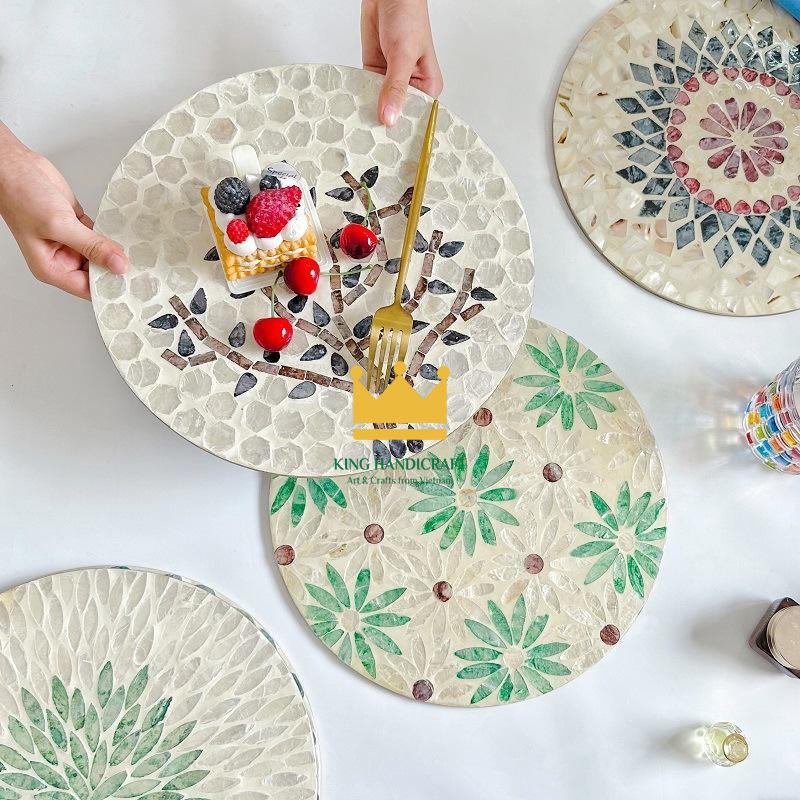 Sets de table ronds bleus élégants en rotin incrustés de motifs de variétés de nacre Plats décoratifs et plateaux de service