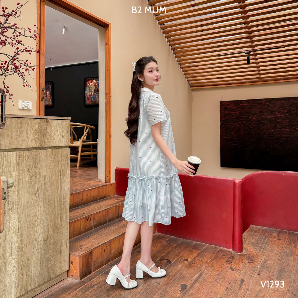 Elegant Blue Striped Dress with Bow Print Sweat-Absorbent V1293 Maternity Clothing Wholesale for Pregnant Women