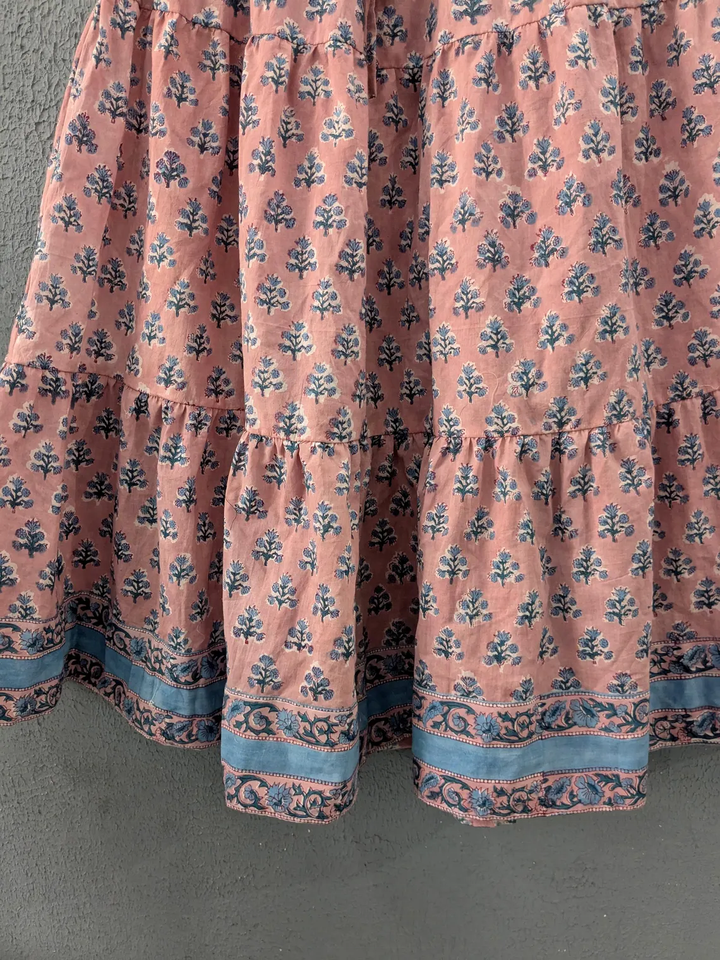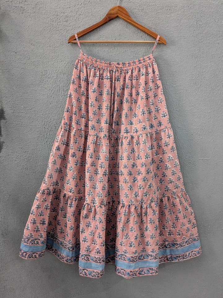 Elegant Blush Pink Floral Tiered Long Skirt for Women Handcrafted Cotton Maxi Skirt with Elastic Waist Traditional Block Print