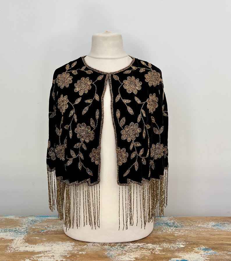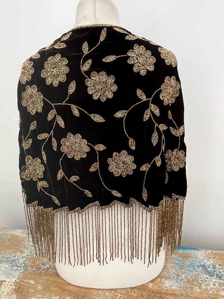 Cape burlesque élégante avec des fils de perles, des paillettes noires, une silhouette magnifique, se ferme au cou, pour les occasions festives, en polyester