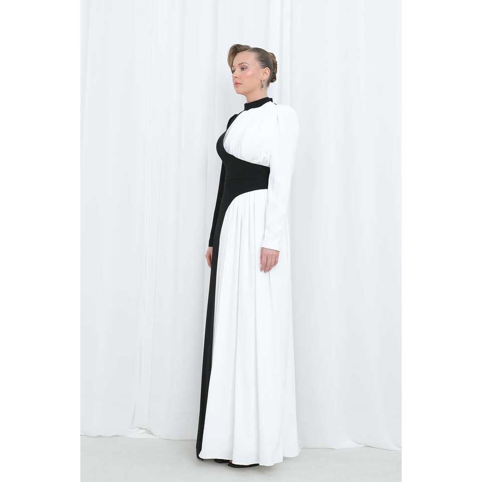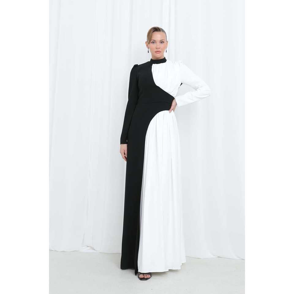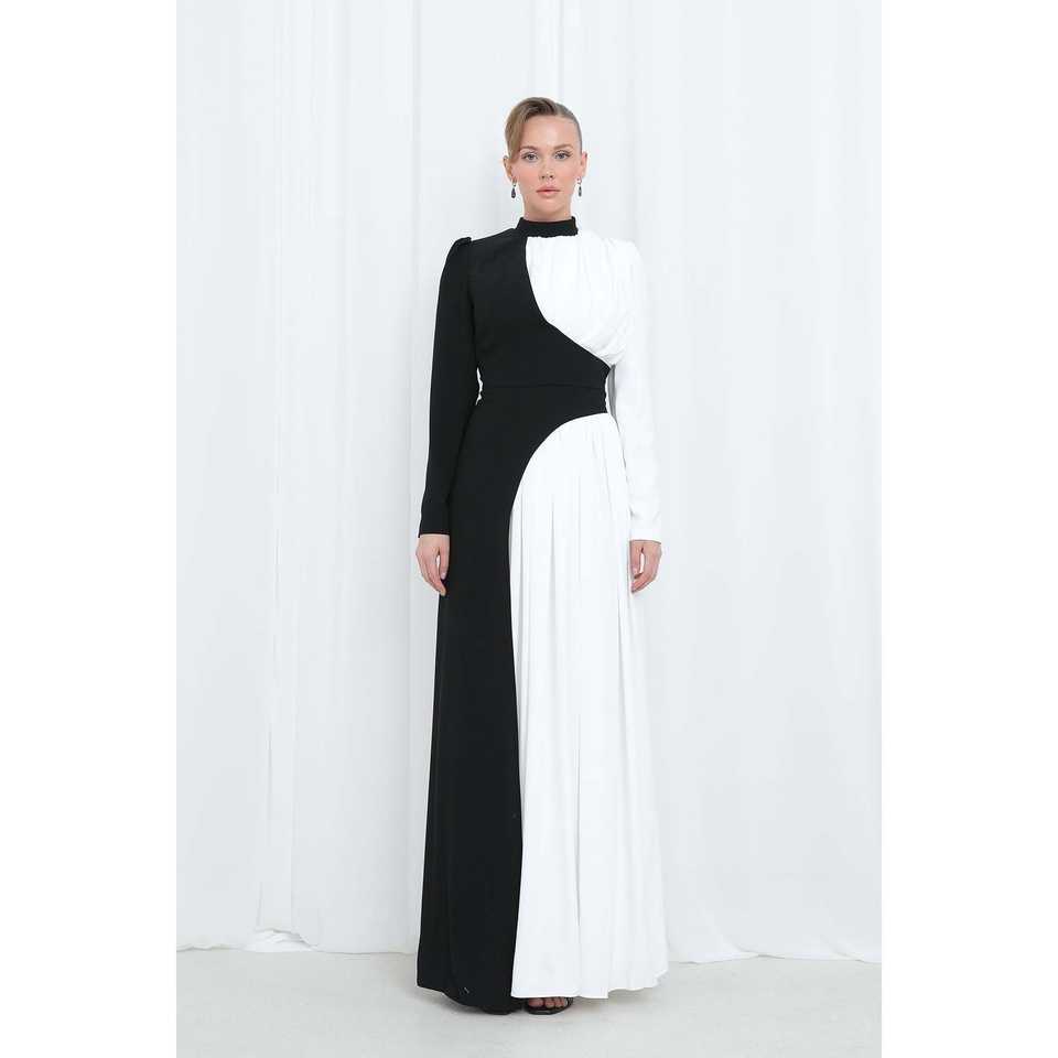 Robe de soirée élégante à col montant, taille naturelle, en satin noir, avec contraste de couleurs