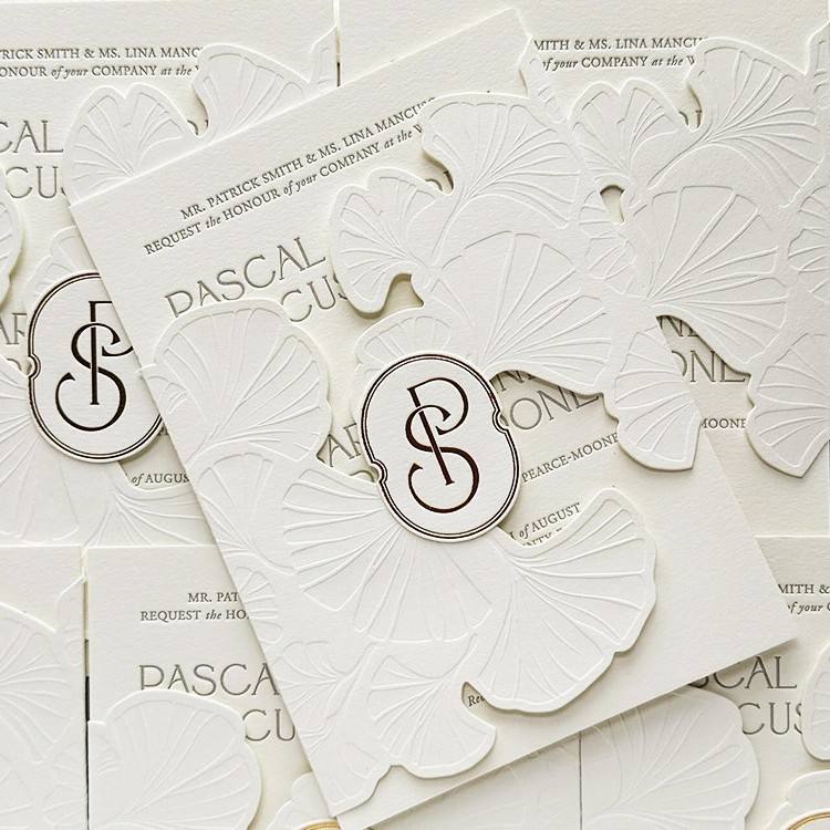 Carte d'invitation de mariage élégante en papier blanc avec motif floral en relief découpé au laser personnalisé avec ensemble d'enveloppes