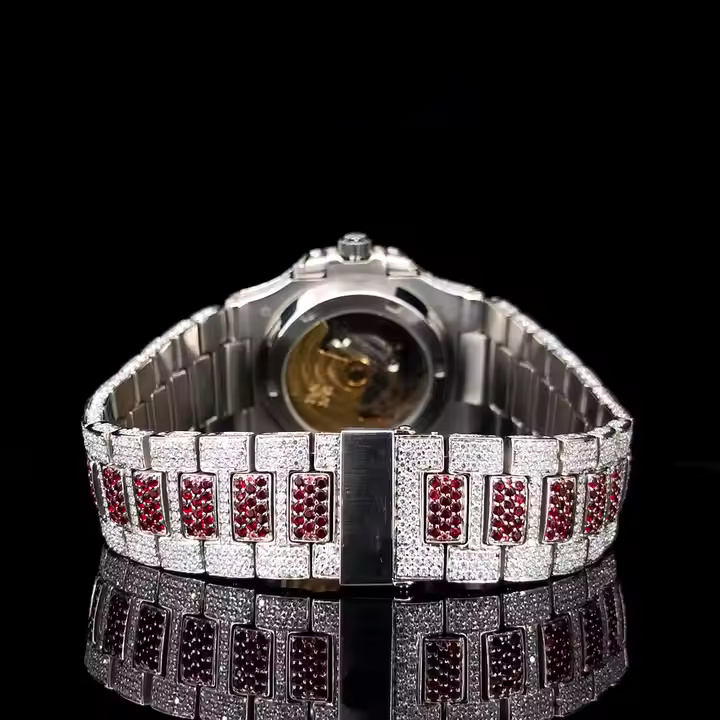 Montre analogique élégante personnalisée, entièrement sertie de diamants, sport, mode, résistante à l'eau, rouge et blanche, sertie de moissanite VVS, en acier inoxydable