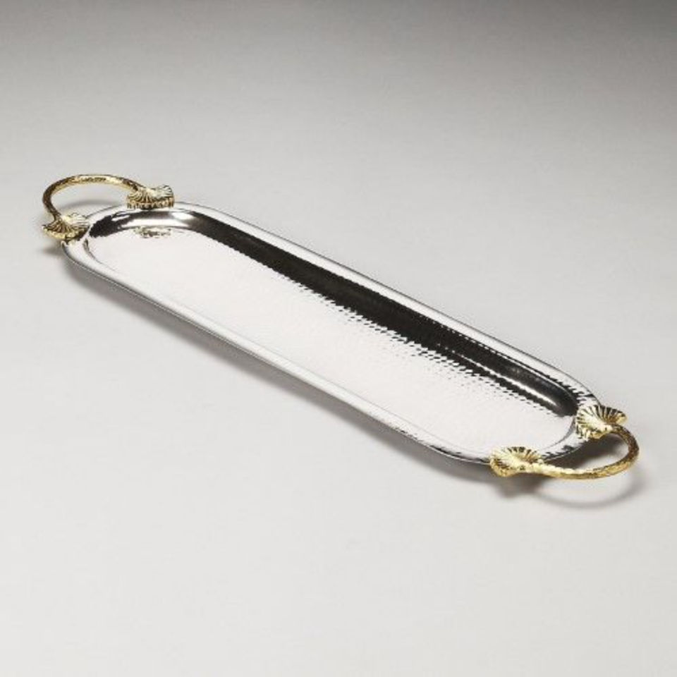 Poignée de designer élégante, centre de table de fantaisie, plateau de serveur de nourriture, plateau en métal argenté de la meilleure qualité avec accessoires pour hôtels