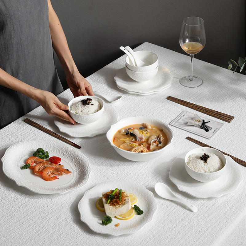 Service de table élégant en céramique blanche gaufrée, assiettes et bols à bord festonné pour dîners formels et cadeaux