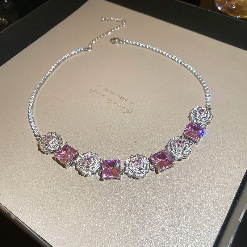 Elegant Fashion Jewelry Set Pink Women Square Zircon Flower Shaped Earrings Necklace and Bracelet Set