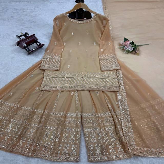 Haut élégant en georgette foux avec fil et broderie séquentielle associé à un plazo cousu et à une bordure en dentelle à quatre côtés Dupatta