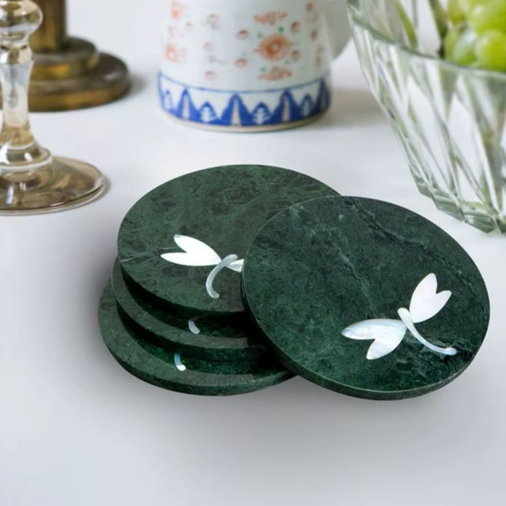 Idée cadeau élégante et classique : Ensemble de sous-verres en marbre gravés avec des motifs floraux, écologiques, protège les surfaces, pour la fête des mères, la fête des pères