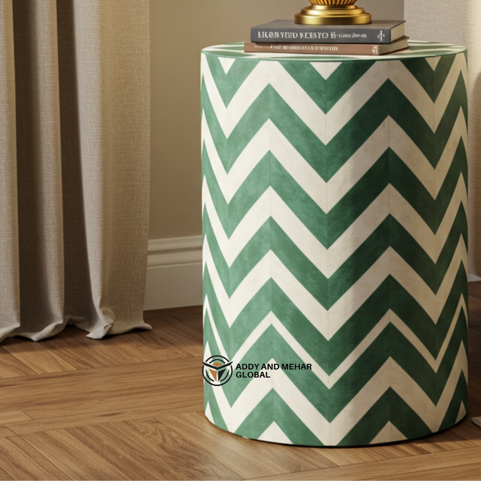 Table d'appoint en forme de tambour en os vert et blanc fait à la main, motif en chevron, table d'appoint/table de chevet pour salon, chambre à coucher