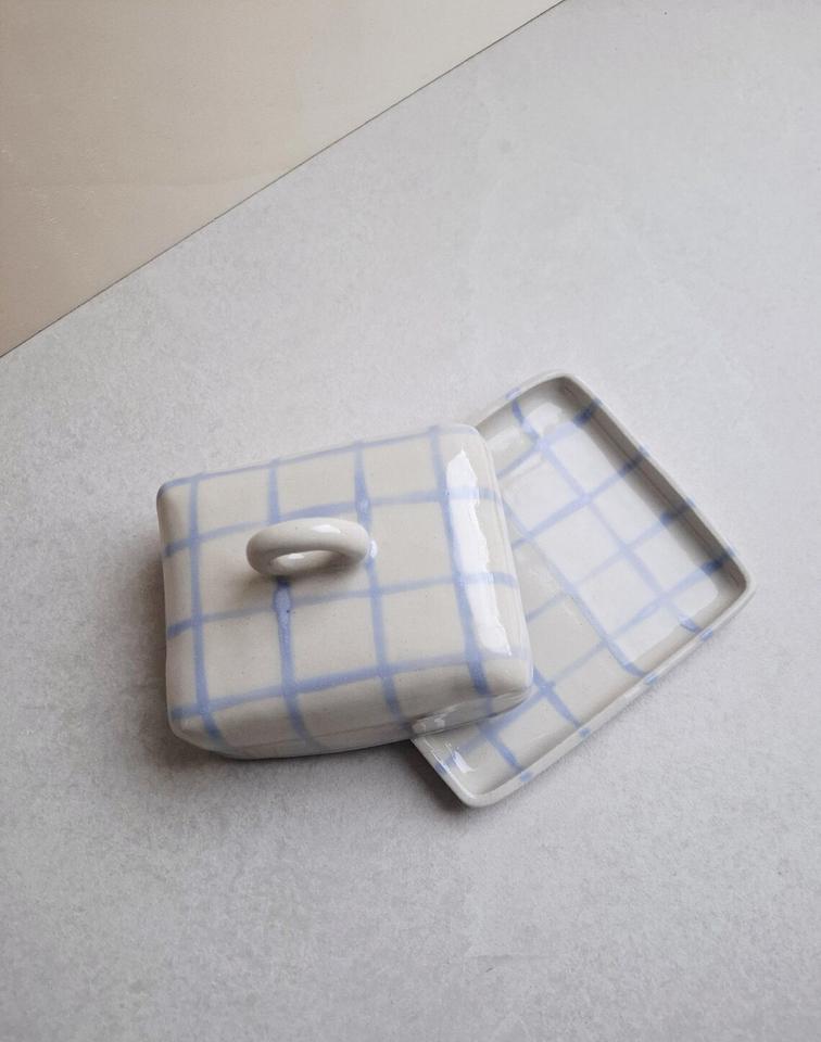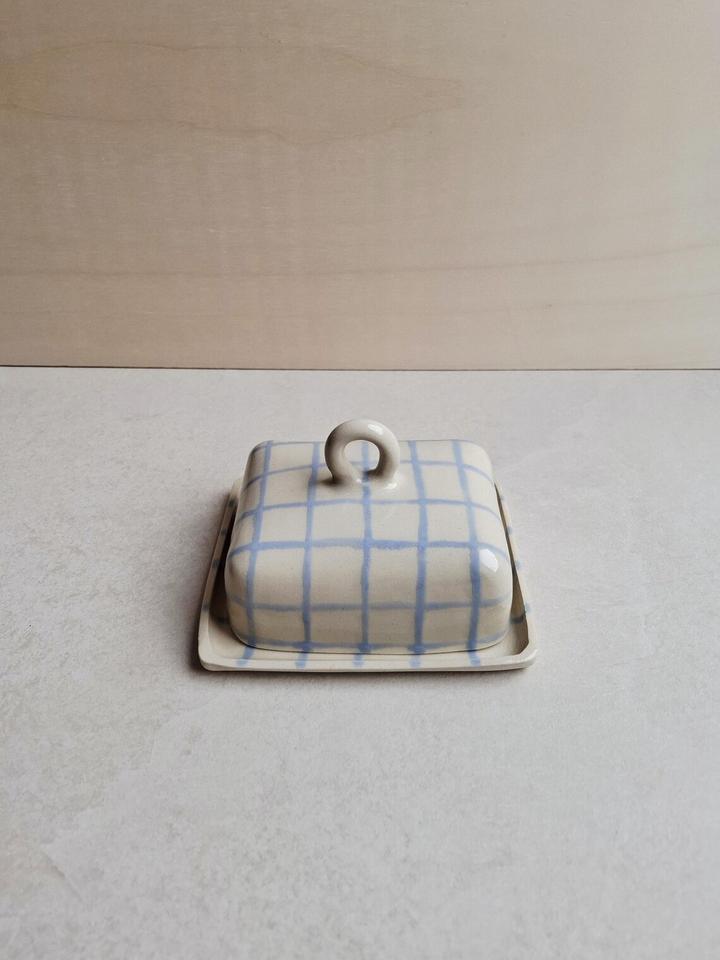 Beurrier élégant à motif quadrillé avec couvercle à anse, design compact avec plateau, finition émaillée lisse, beurrier de cuisine moderne
