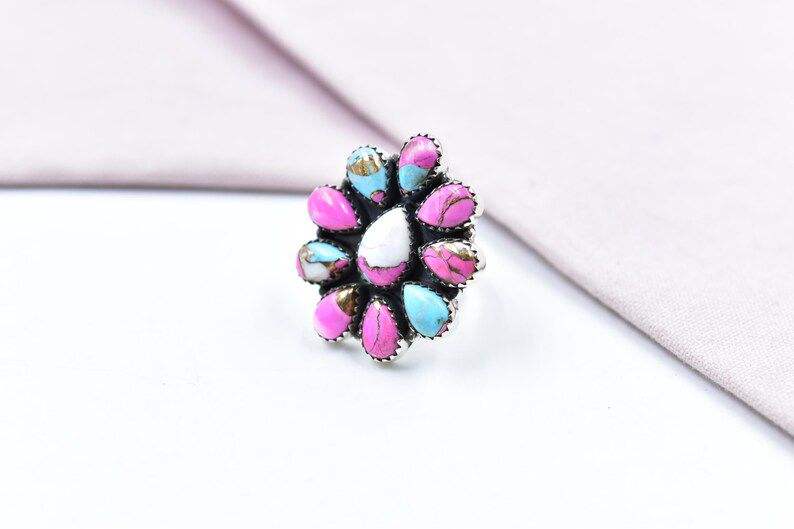 Elegant Handmade Cotton Candy Dahlia Sterling Silver Adjustable Ring Bohemian Pastel Jewelry For Special Occasion