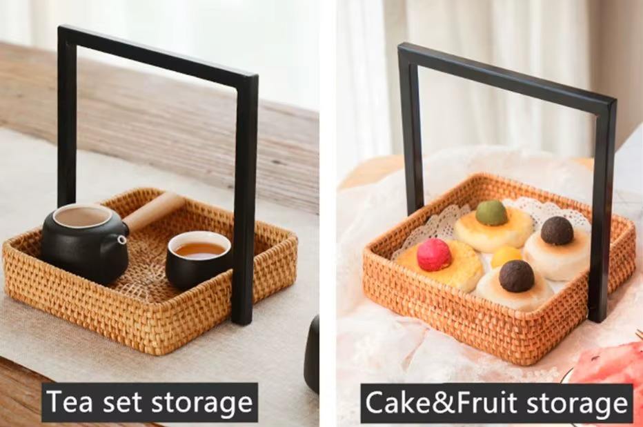 Elegant Handwoven Rattan Tray with Metal Handle Decorative Serving Tray for Bread Snacks Fruit Basket or Tabletop Decor