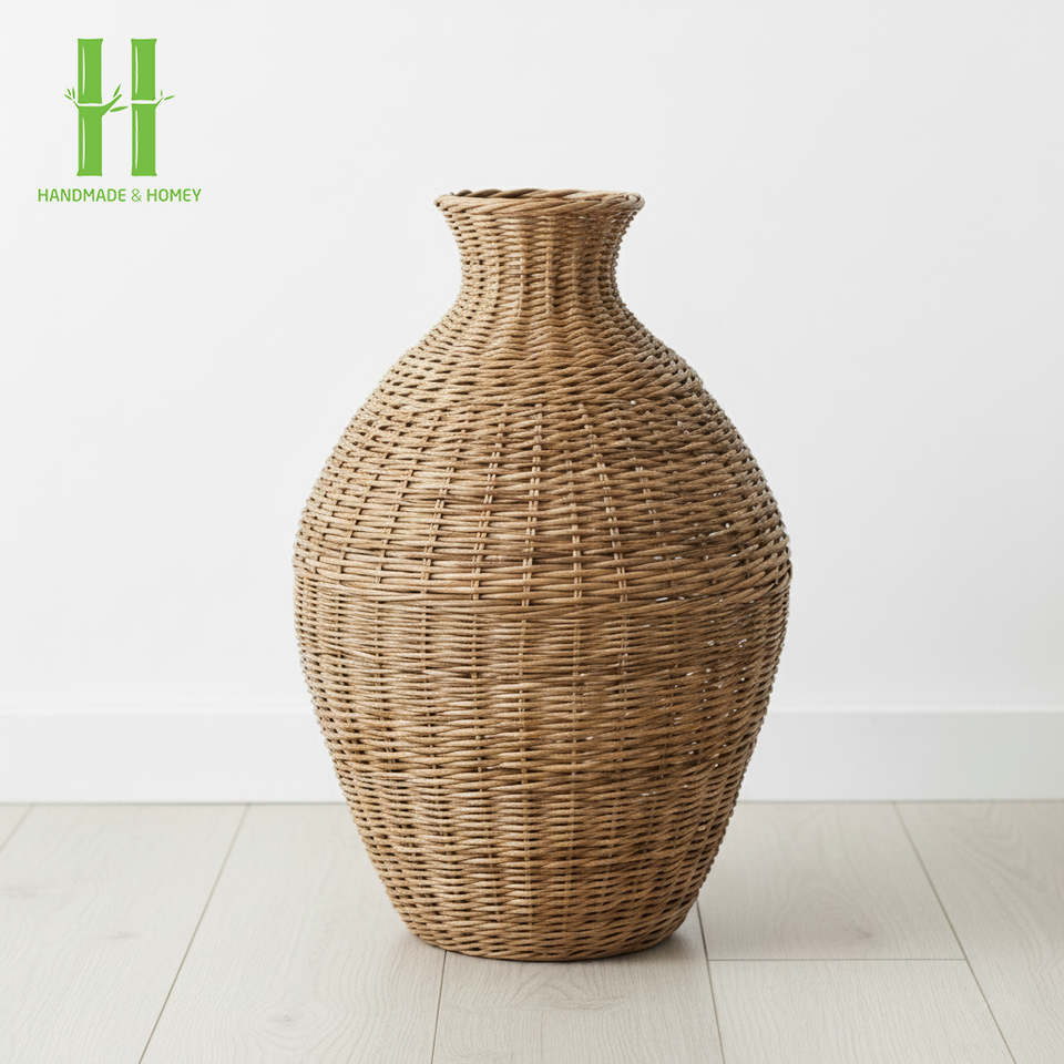 Vase élégant en rotin tissé à la main avec poignées pour la décoration intérieure Vase décoratif naturel pour fleurs séchées Fournisseur en gros du Vietnam