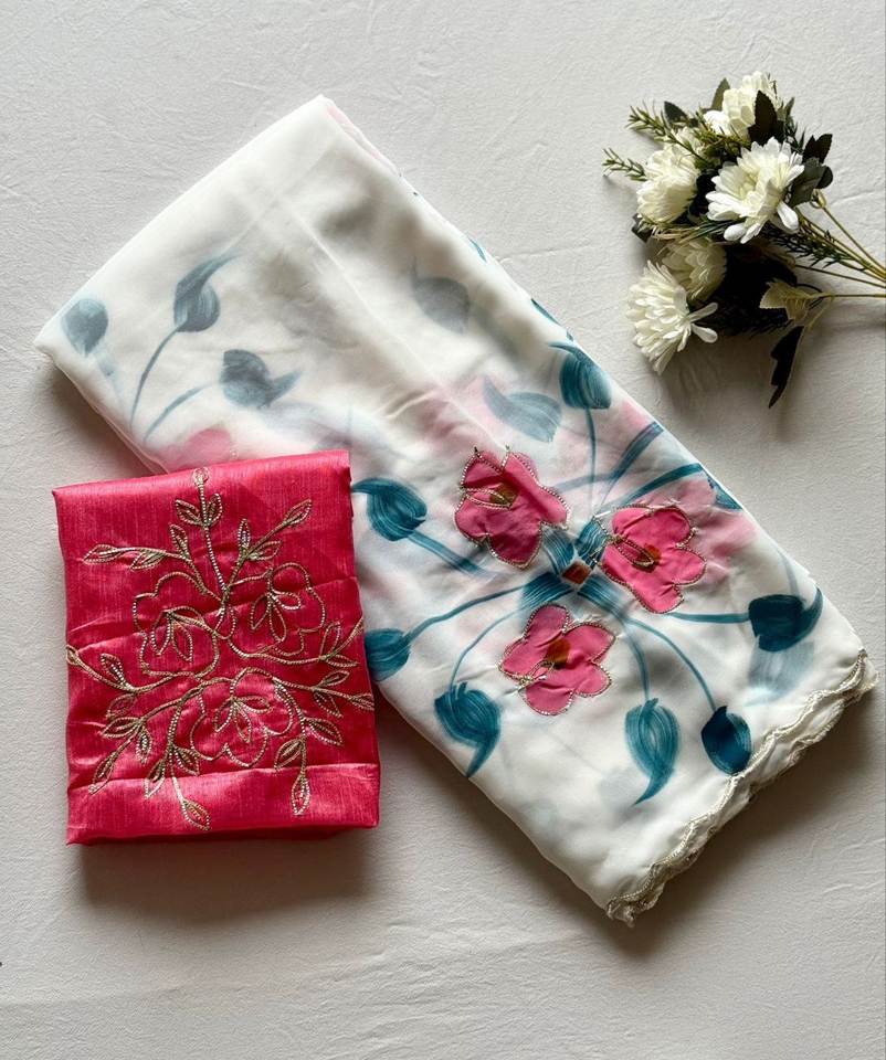 Nom du produit:Saree élégant en georgette douce avec imprimé floral et rubans.