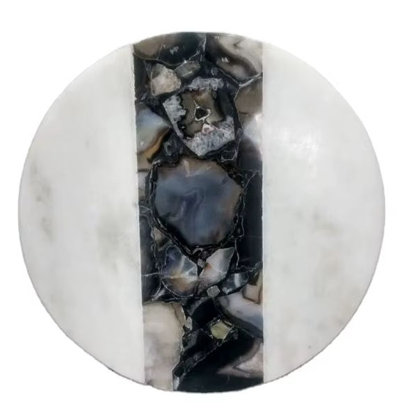 Service à thé élégant en marbre, design abstrait gravé avec incrustations de pierres concassées, style hindou, pour décoration d'intérieur moderne, pièce d'art décorative
