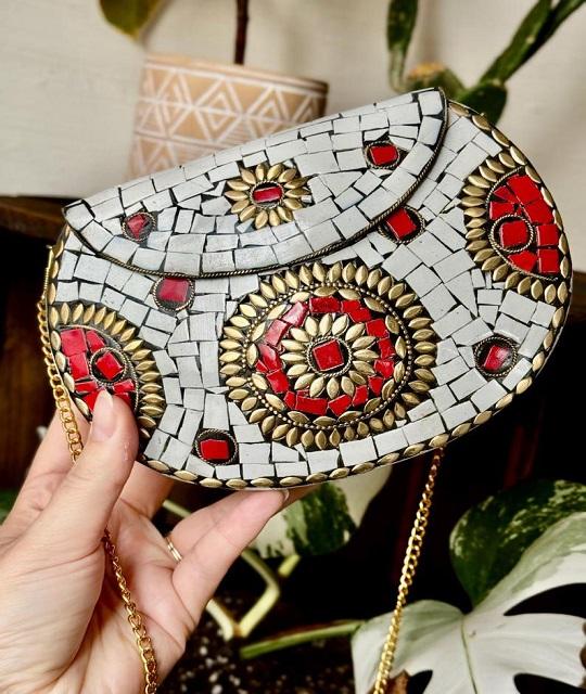 Elegant Metal Mosaic Clutch with Pearl Strap Handmade Engraved Party Purse for Brides and Fashionable Evenings