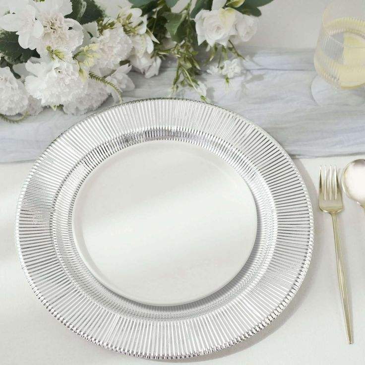 Assiette de présentation élégante en métal argenté poli brillant, faite à la main, au design moderne, pour table de réception de mariage et repas de prestige