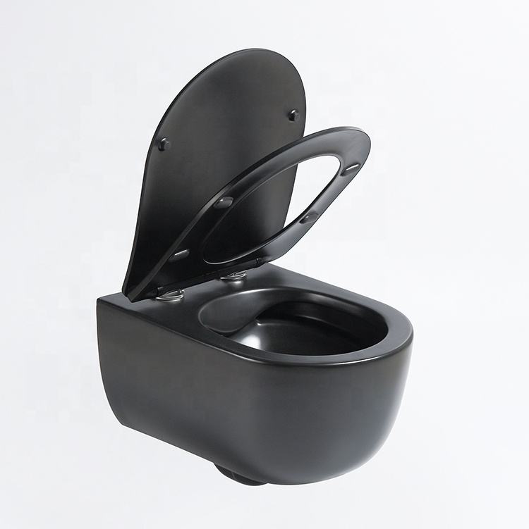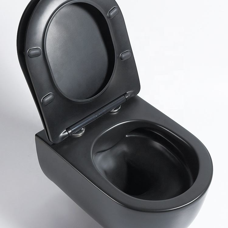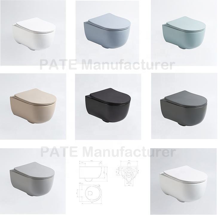 Cuvette de toilettes suspendue murale élégante et moderne sans rebord, couleur mate, pour salle de bain d'hôtel