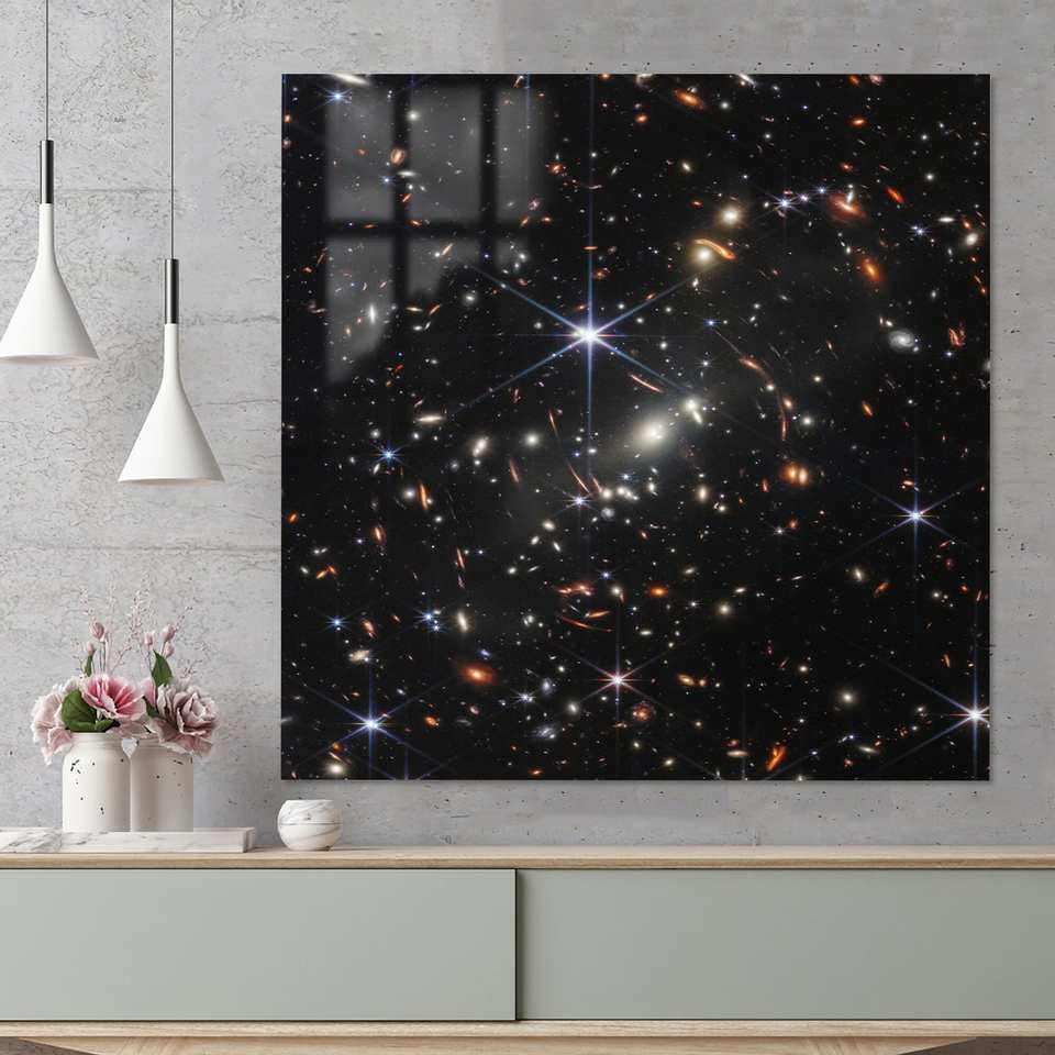 Élégant panneau mural en verre trempé imprimé NASA Deep Field Art Déco, design carré moderne