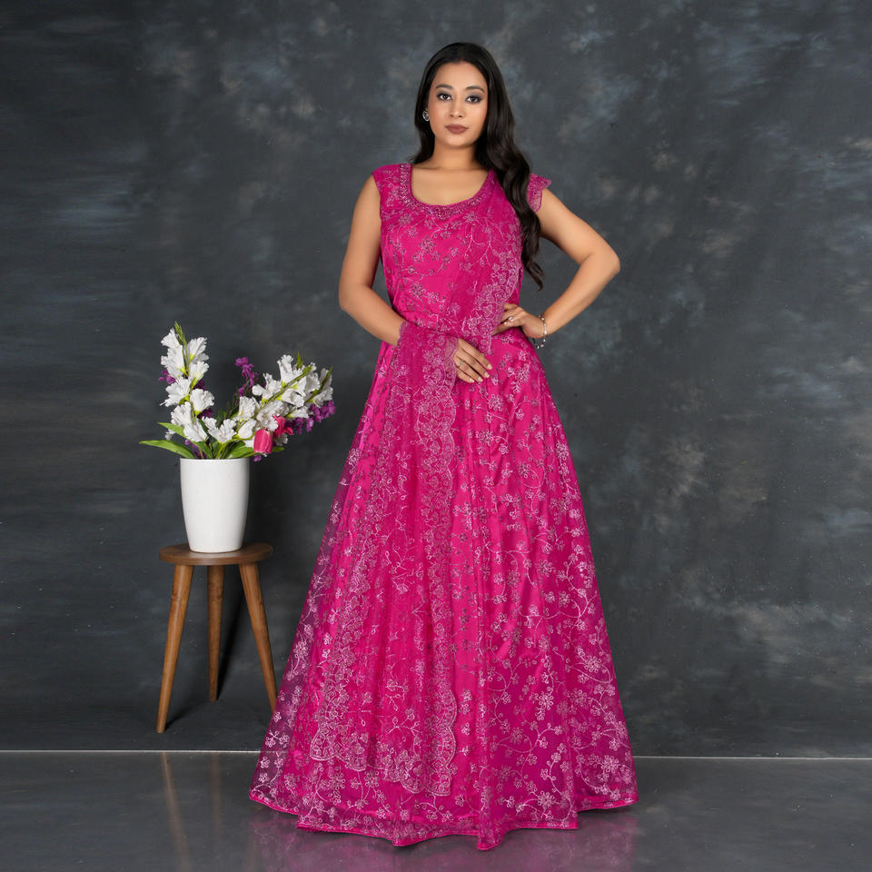 Robe longue élégante en tulle brodé, silhouette évasée, séchage rapide, avec dupatta doux, idéale pour mariage, Diwali, plage et occasions spéciales