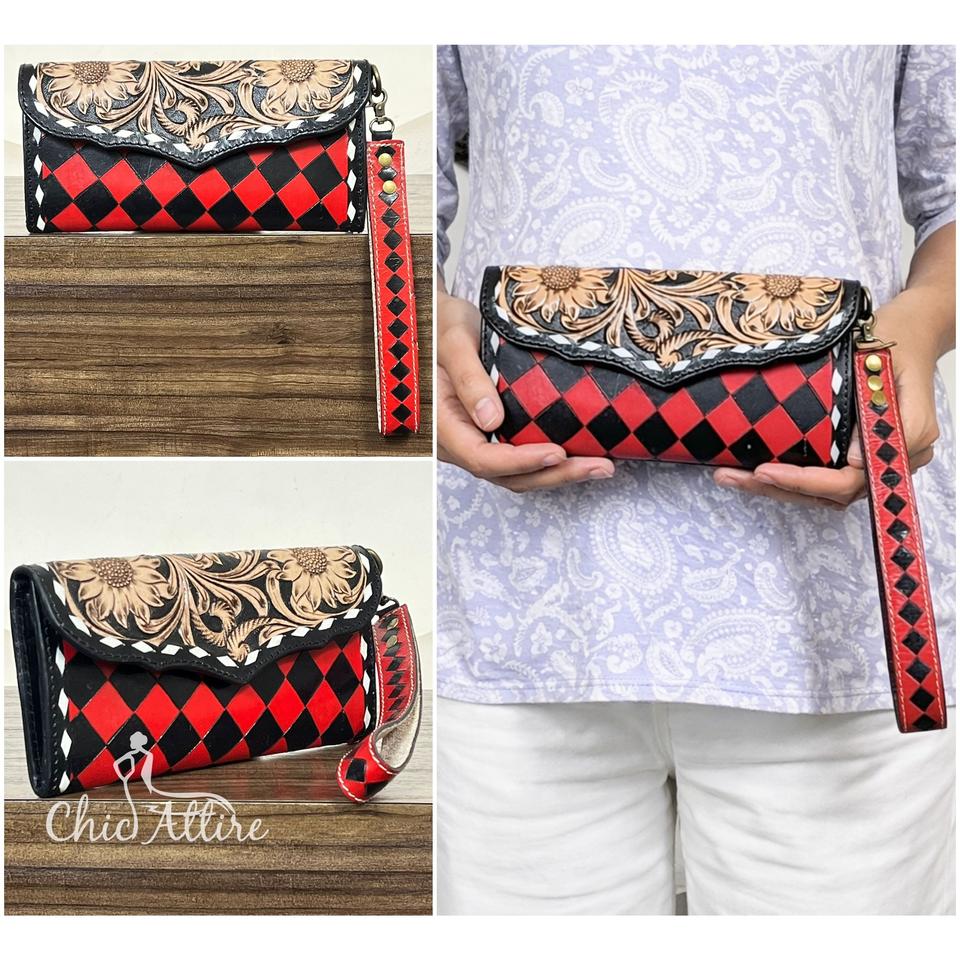 Product name:Hand Tooled Checkered Leather Wristlet Wallet