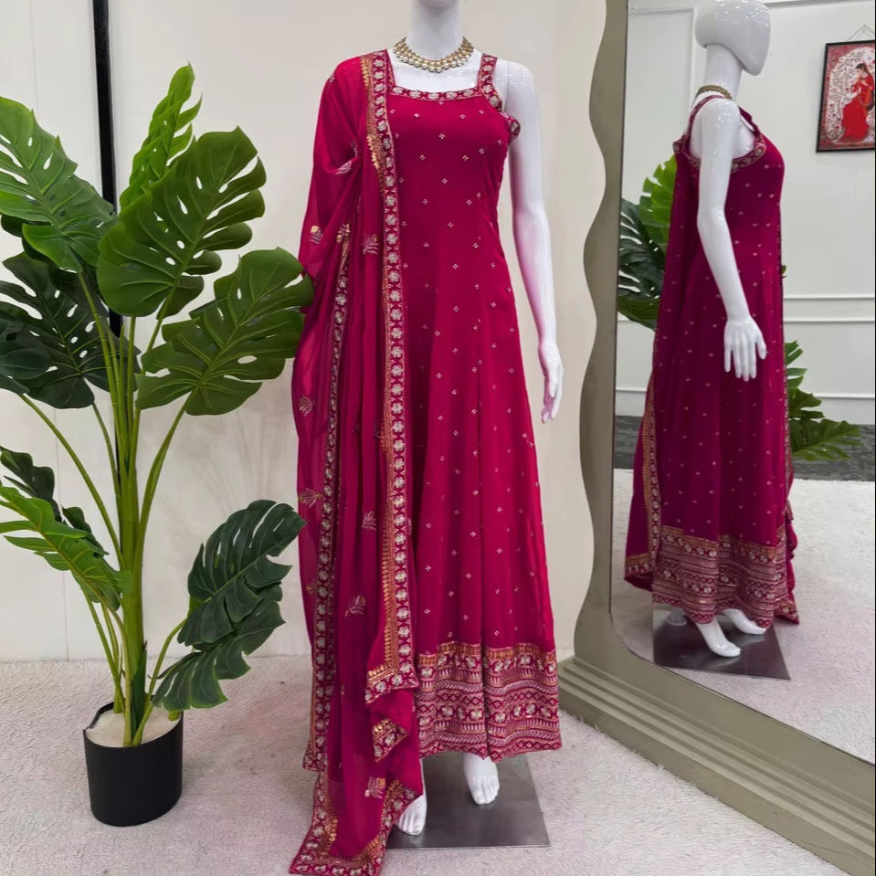 Elegant Red Embroidered Bollywood Gown Chinon Silk Fabric with Sequenced Dupatta for Summer Winter Parties with Inner Coding