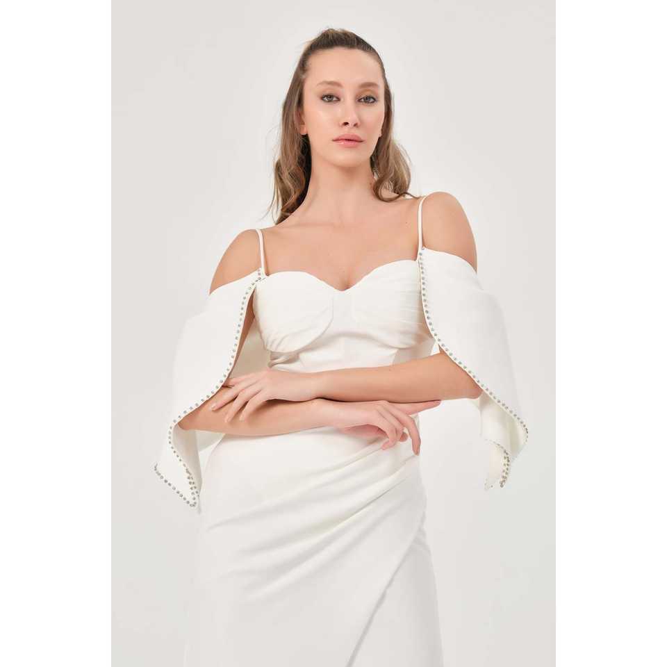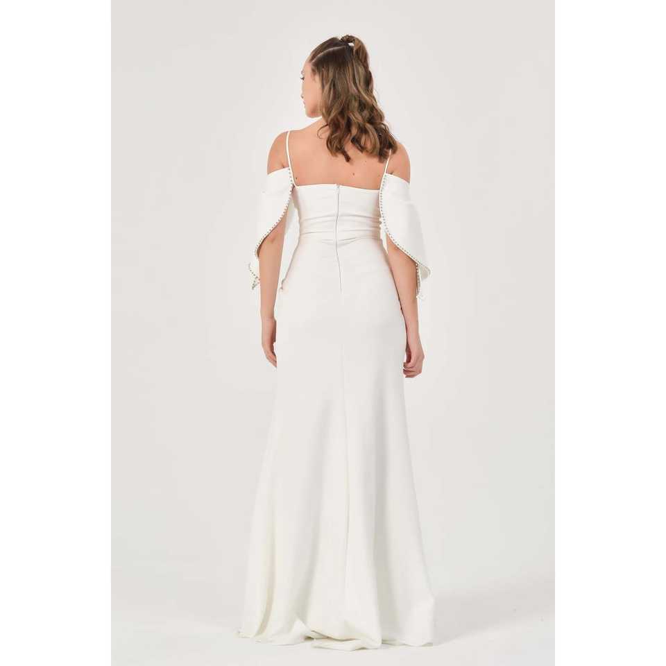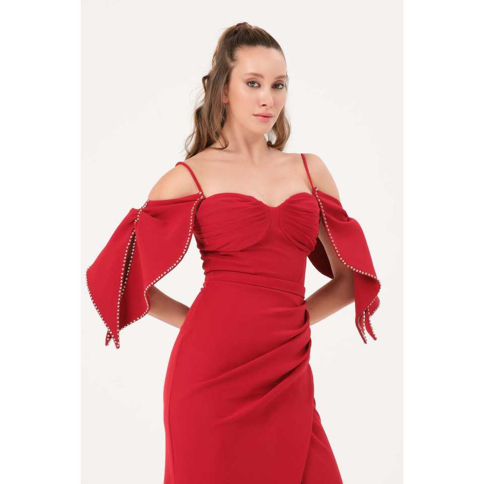 Robe de soirée élégante rouge à épaules dénudées, coupe fourreau, avec corsage froncé et tissu satiné, taille naturelle