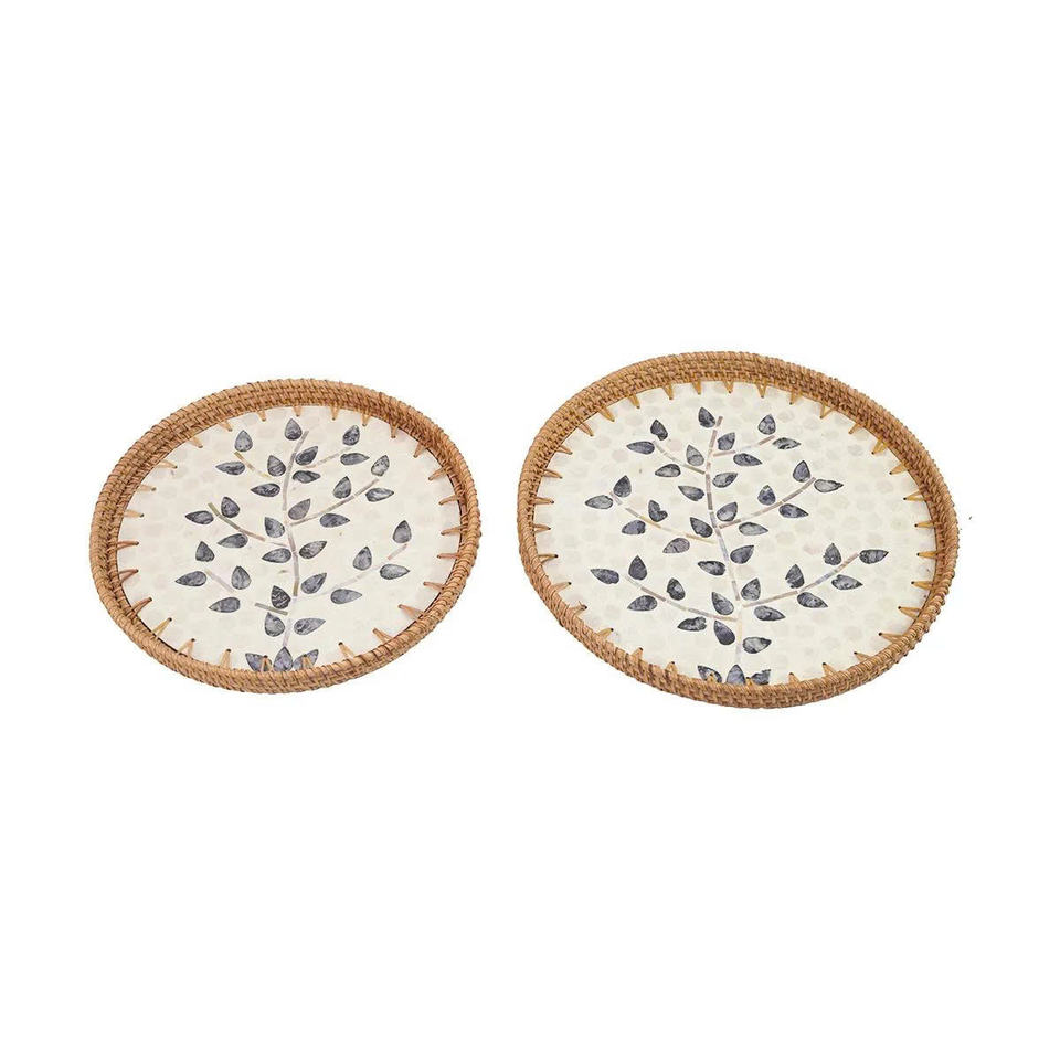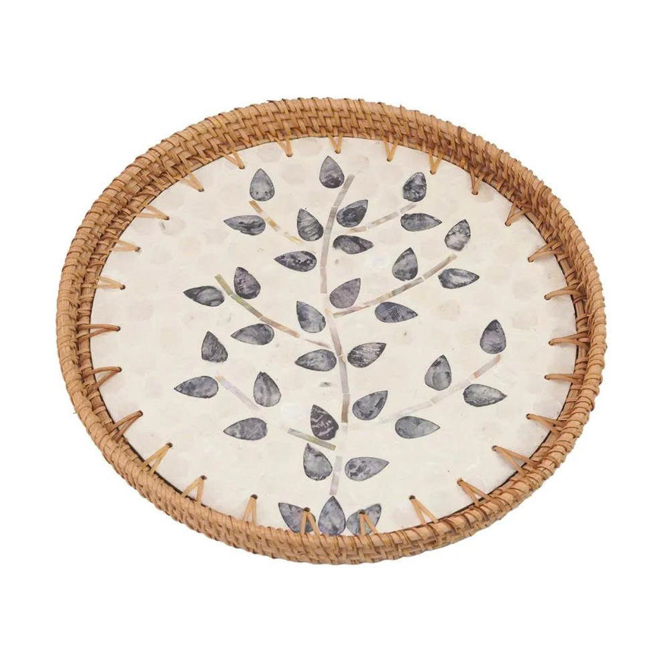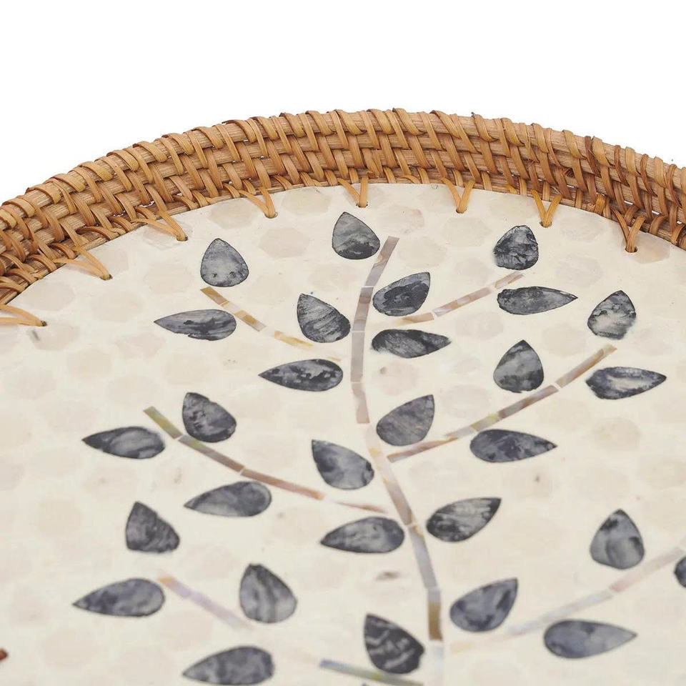 Plateau de service rond élégant en rotin avec incrustation de feuilles de nacre, cadre naturel tissé à la main, plateau décoratif sophistiqué