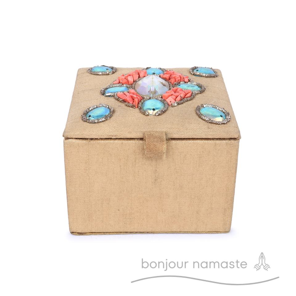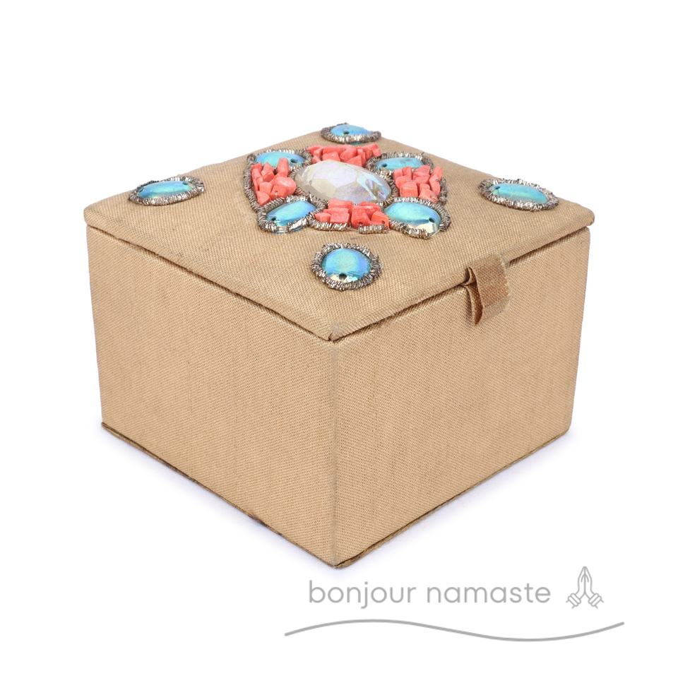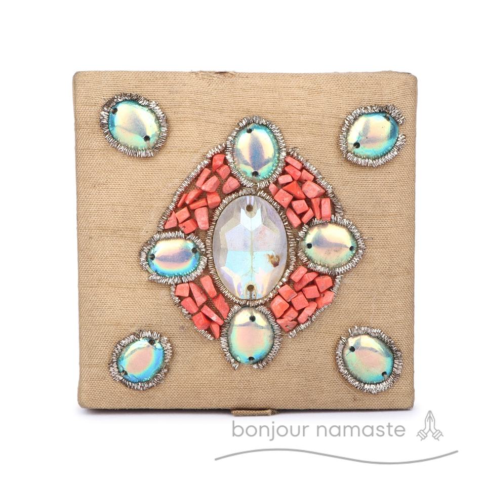 Elegant Square Sand Colored Handcrafted Jewelry Box | Embroidered Beaded Studded Luxury Organizer Magnetic Closure | Luxury