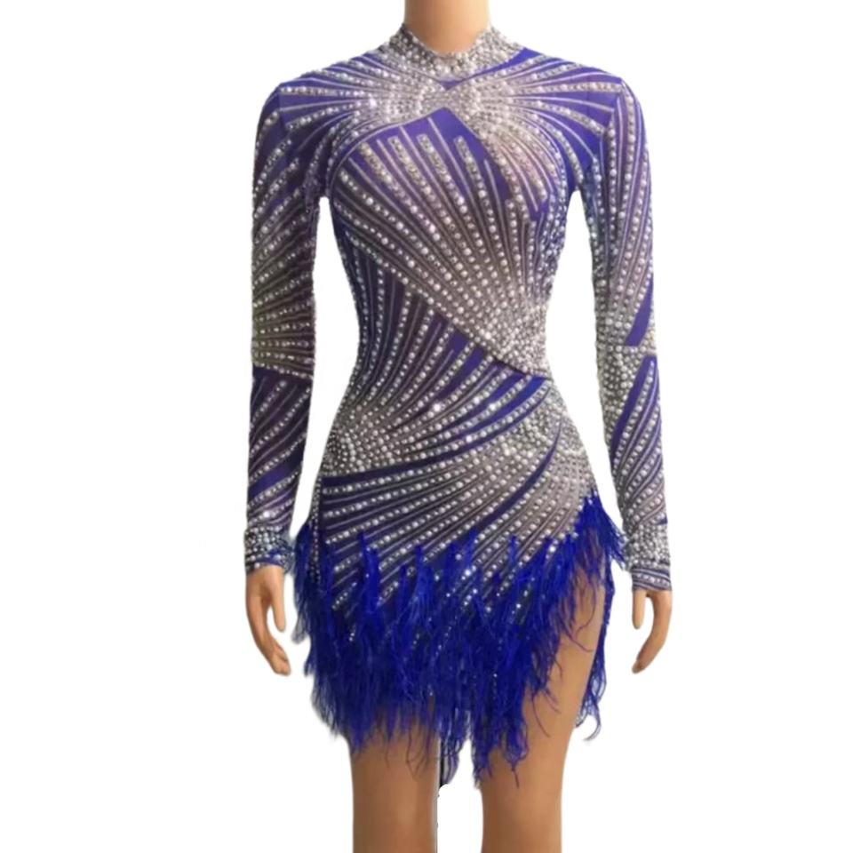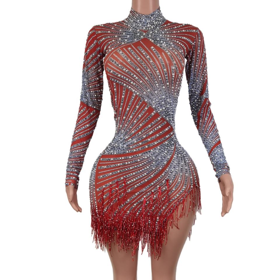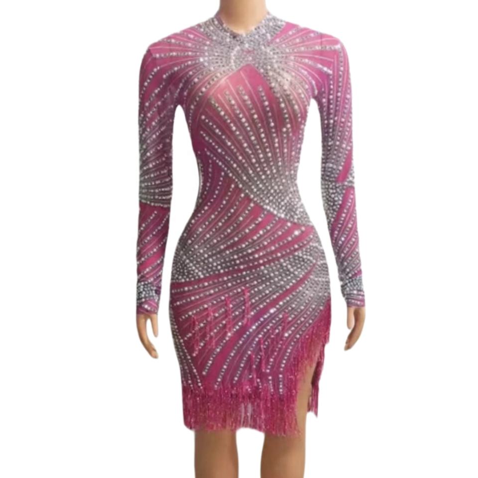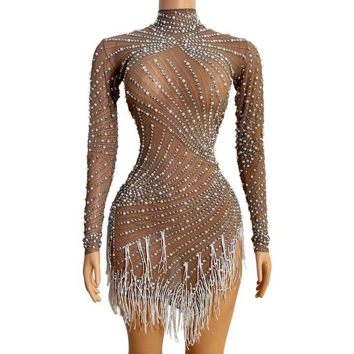 Robe de soirée élégante transparente à perles avec strass et franges Robe de soirée à fente pour femmes Robe de club de cocktail de grande taille
