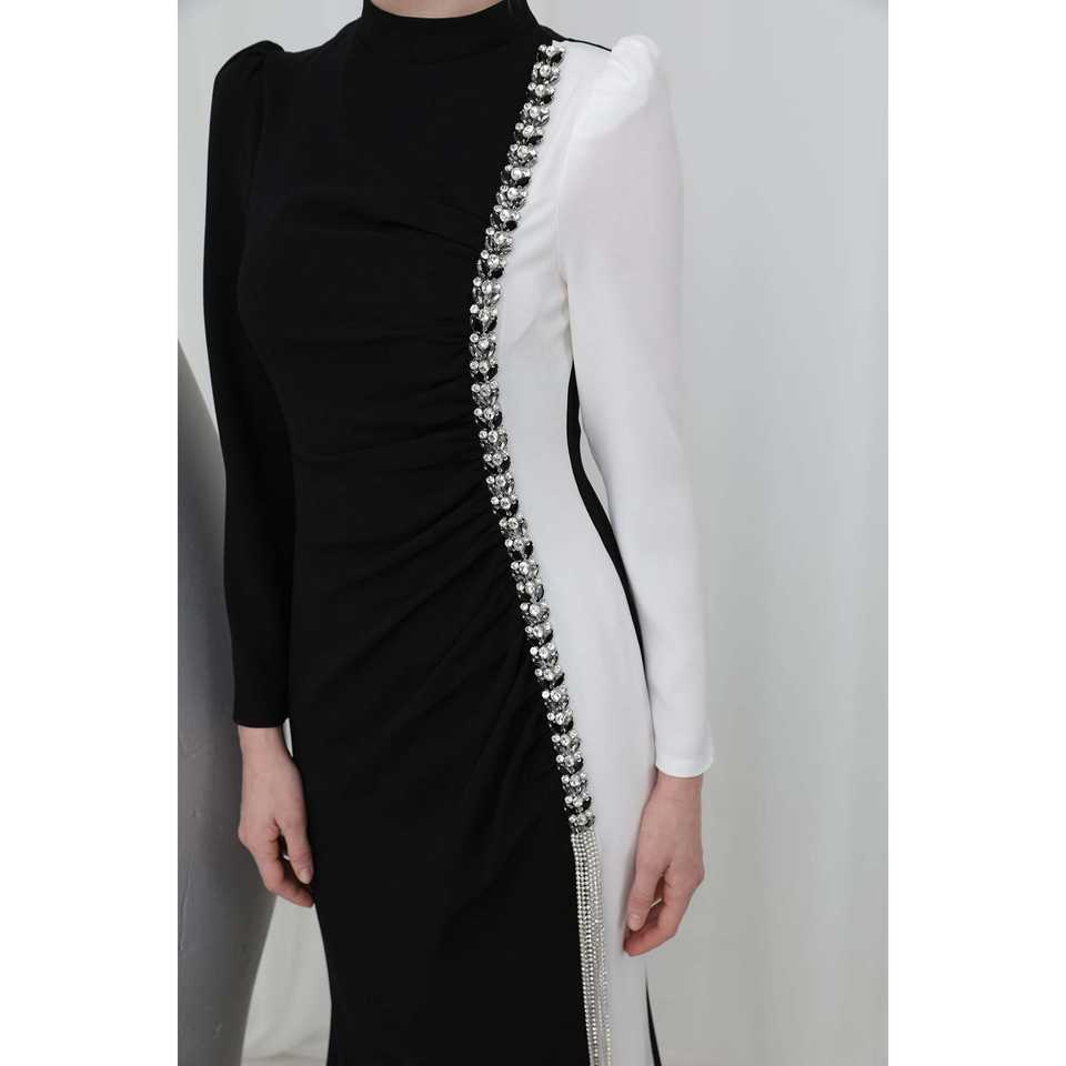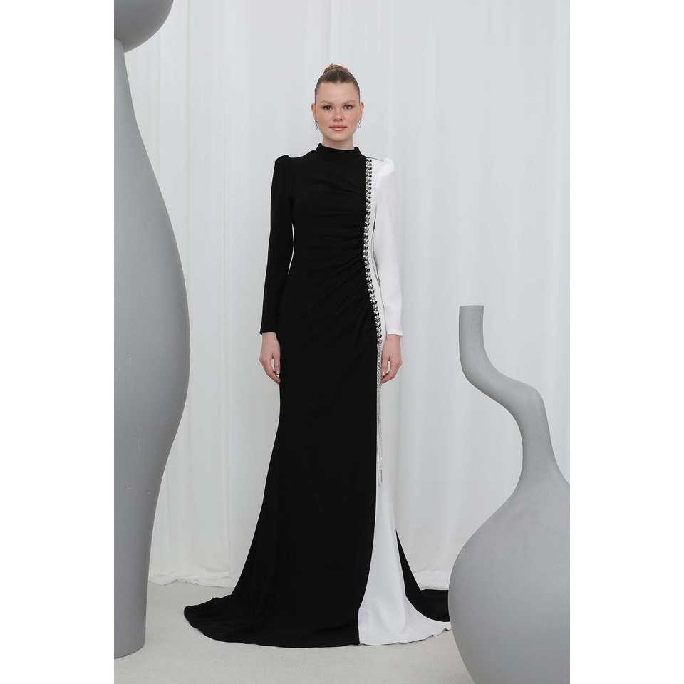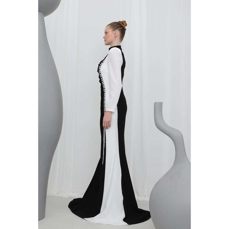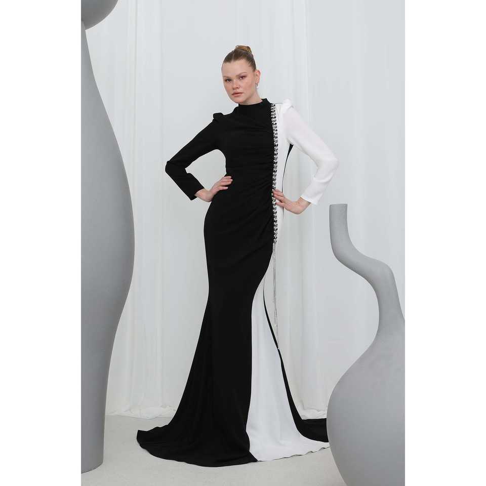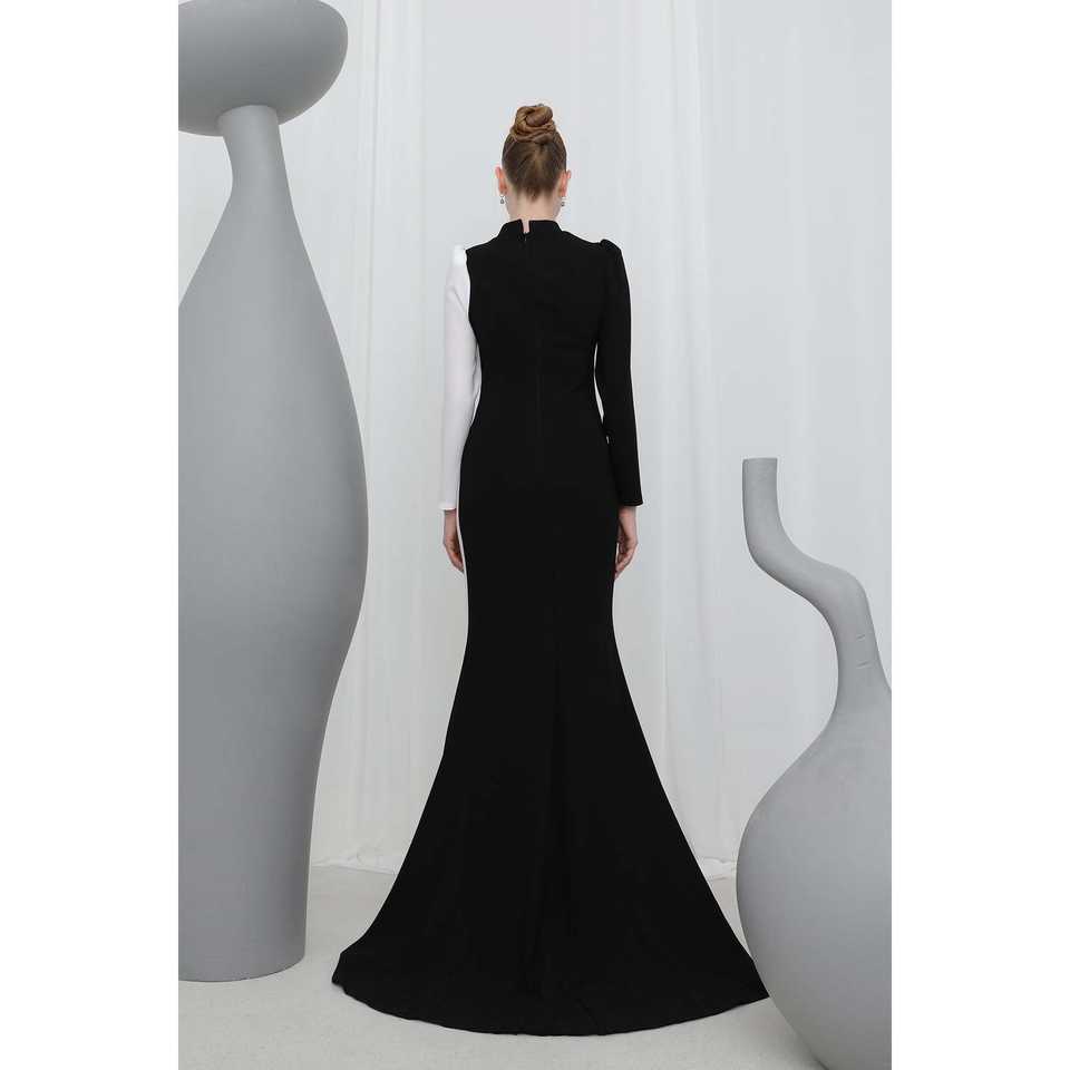 Robe de mariée élégante et discrète, coupe fourreau, col montant, taille naturelle, en charmeuse, à manches longues et couleur contrastante, robe de soirée formelle