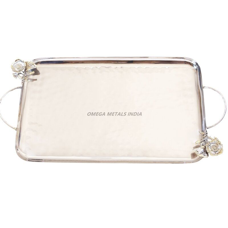 Plateau de service rectangulaire élégant en argent avec poignées florales pour un divertissement haut de gamme et un affichage à la maison