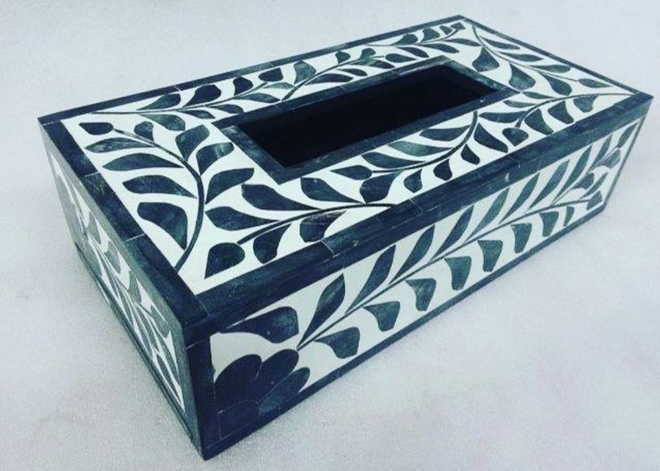 Boîte à mouchoirs élégante et élégante en forme d'incrustation d'os faite à la main avec un motif de feuille noire en résine et bois pour la décoration de table à manger à la maison