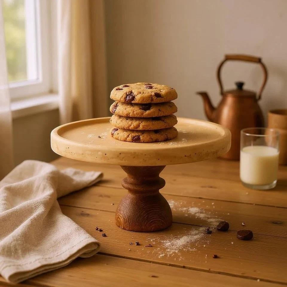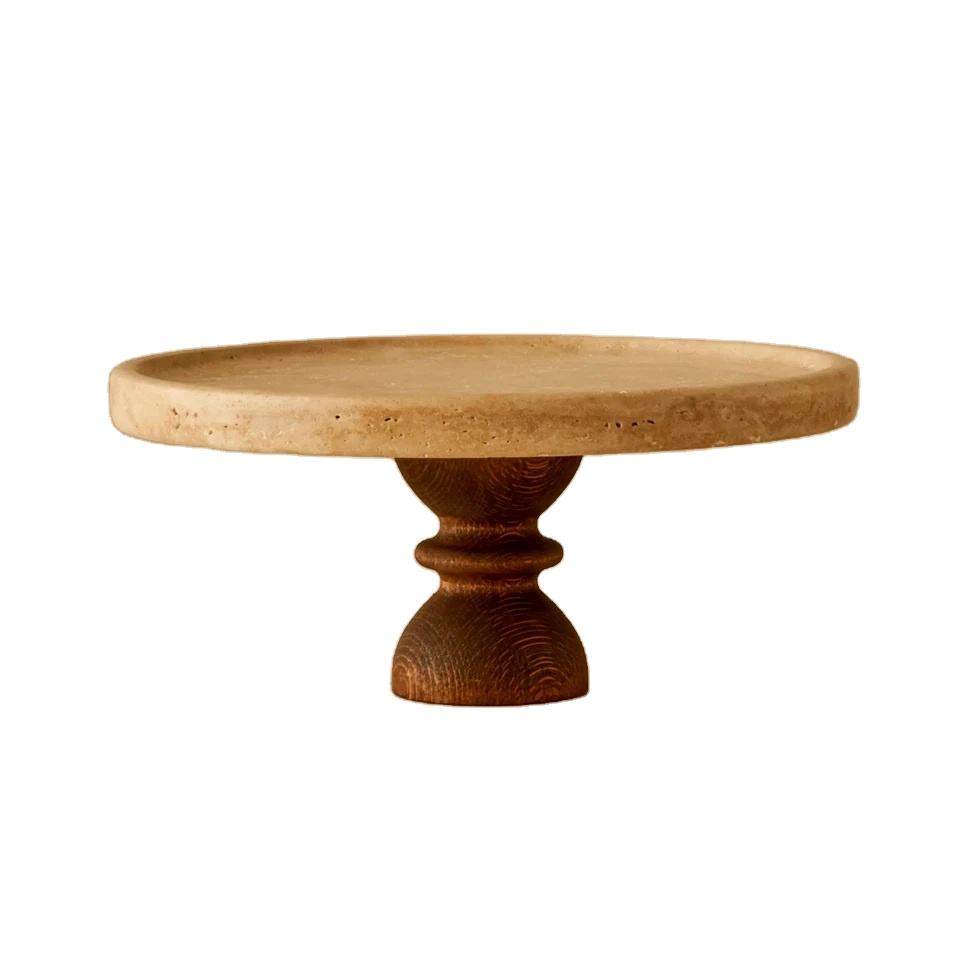 Support à gâteau élégant en pierre de travertin avec base en bois sculpté, élégant présentoir artisanal pour la décoration et le service de la maison moderne